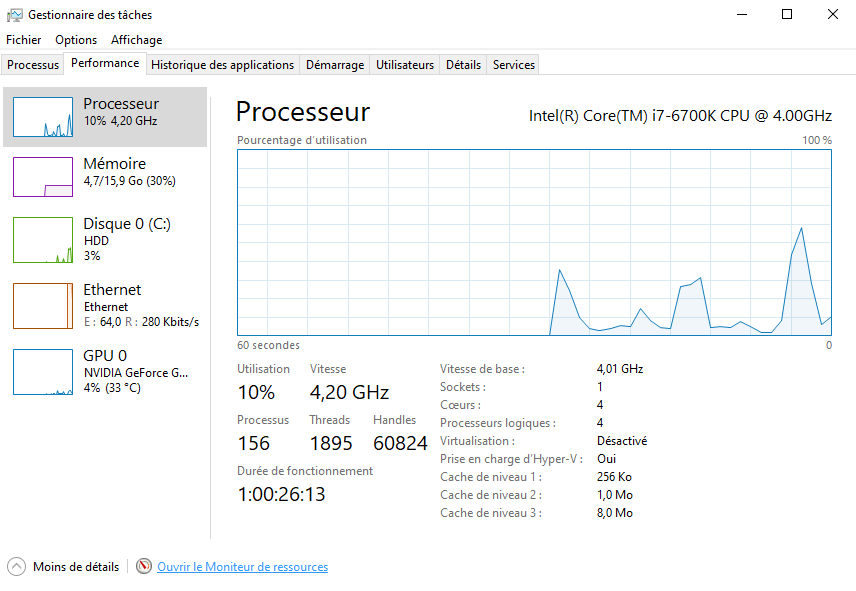 Nous avons décidé d'opter pour un processeur Intel de 7ème génération [I7-6700k] doté de quatre cœurs overclockés à une fréquence de 4,20 Ghz chacun.